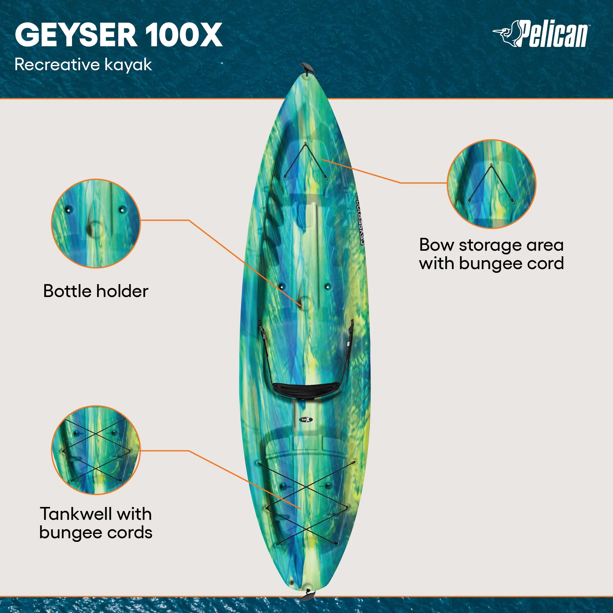 Built with durable materials, the Geyser 100X ensures long-lasting use while remaining easy to transport and maneuver. The sit-on-top design provides added stability and convenience, making it ideal for first-time users.