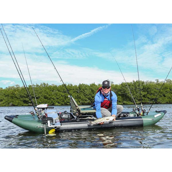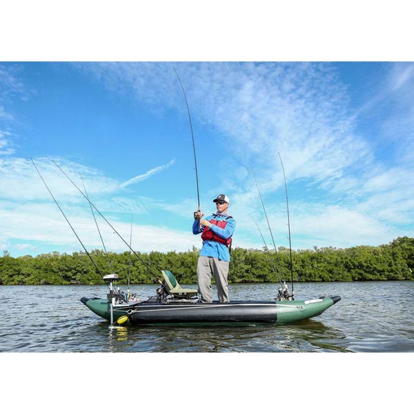 Featuring: double layered, nearly indestructible, tough as crocodile hide, 2000 Denier reinforced protective layers, 6 built-in rod holders, forward and aft spray skirts with Sea Eagle exclusive accessory belts to hold your tools, hooks, and lures, a fully adjustable foot brace called the FlexBrace™, 40″ FishRuler™, anchor trolley D-rings, a huge max load capacity of 575 lbs., and is completely self-bailing. So bring on the roughest conditions and still get to those fish!